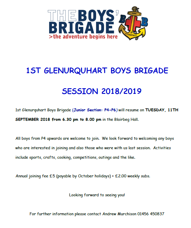The Boys’ Brigade Posted on September 24, 2019 by Kerrie Laird See information below about The Boy’s Brigade which is on each Tuesday night in Blairbeg Hall. Share this: Share on X (Opens in new window) X Share on Facebook (Opens in new window) Facebook Like Loading... Related