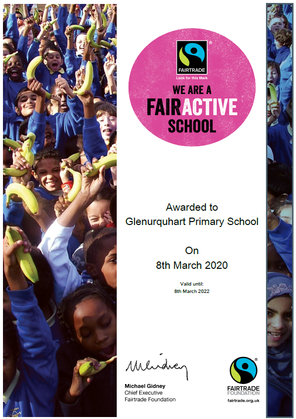 We received our Fair Trade Active Award today following all the work over the previous year, activities in Fair Trade Fortnight and partnership with Scotmid. Another excellent achievement for the school.